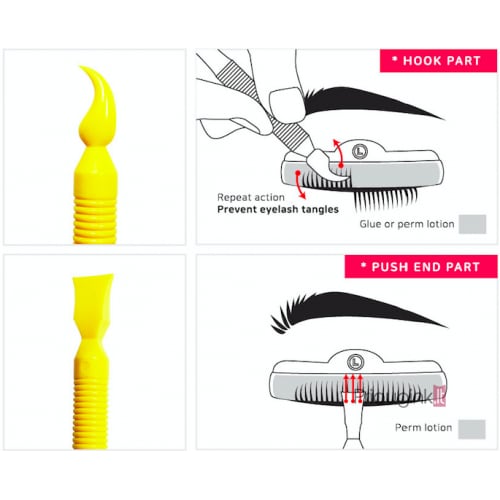 フックパーツでまつ毛1本1本を簡単にかきあげて、プッシュパーツでまつ毛にしっかりと